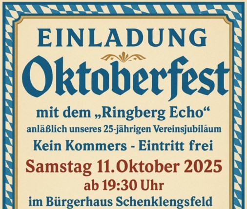 Oktoberfest im Bürgerhaus mit dem Ringbergecho Zum 25-jährigen Jubiläum des Ski-Club Oberlengsfeld findet am 11.10.2025 ab 19.30 Uhr ein zünftiges Oktoberfest mit Livemusik statt. Eintritt frei Weiterlesen